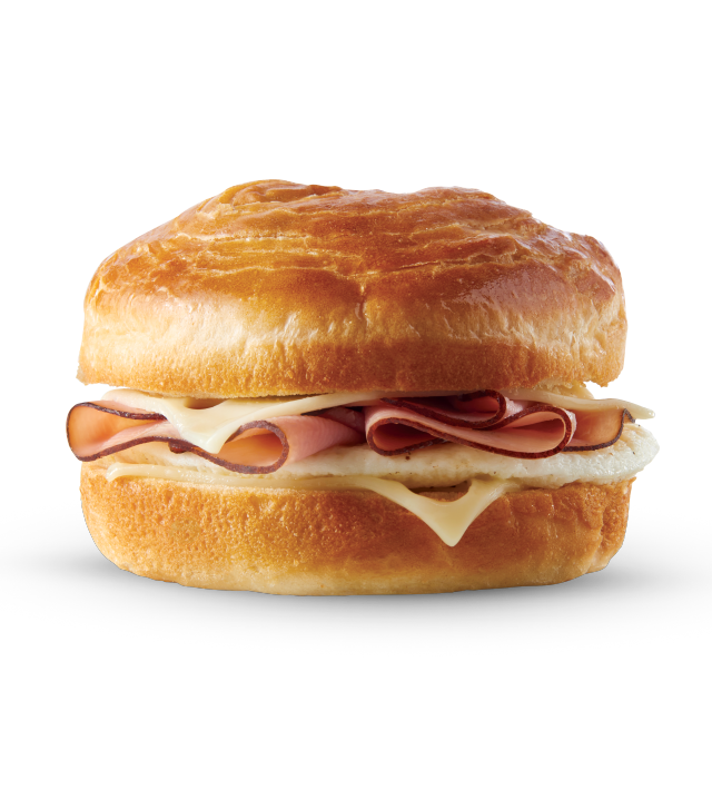 Hardwood smoked ham, Swiss cheese, and a cage-free fried egg on a buttery spiral croissant.