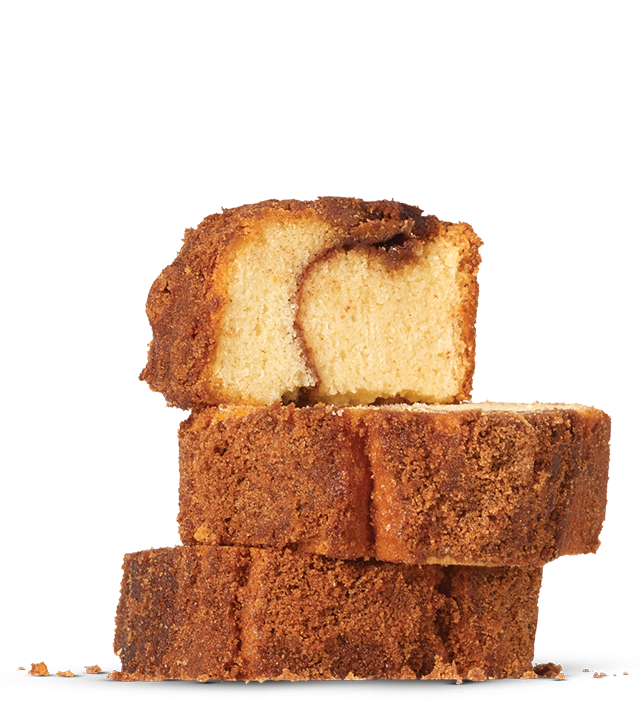 Coffee cake with a cinnamon and caramel streusel center; topped with crunchy brown sugar and cinnamon.