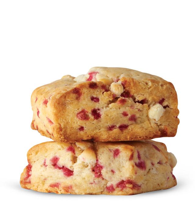 A raspberry scone with white chocolate chunks; sprinkled with coarse sugar.