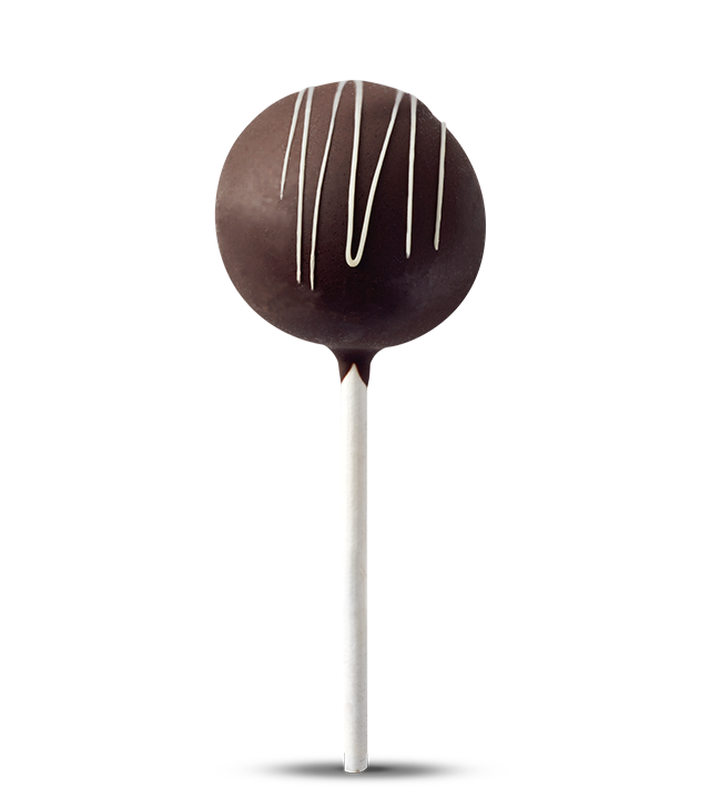 A rich chocolate cake ball dipped in dark chocolate glaze; topped with white icing drizzle.