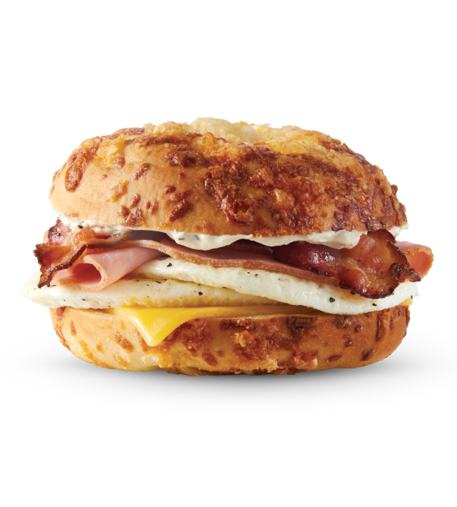 Cherrywood smoked ham, bacon, cheddar cheese and two cage-free fried eggs with peppered cream cheese on a hash brown bagel.