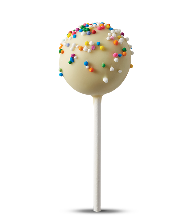 A vanilla cake ball dipped in white glaze; topped with multi-colored sprinkles.