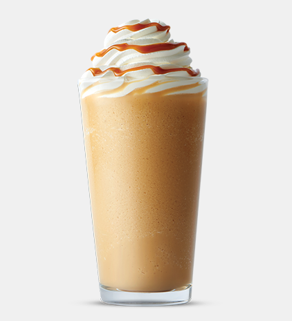 Coffee blended with ice and caramel flavor. Topped with whipped cream and caramel drizzle.