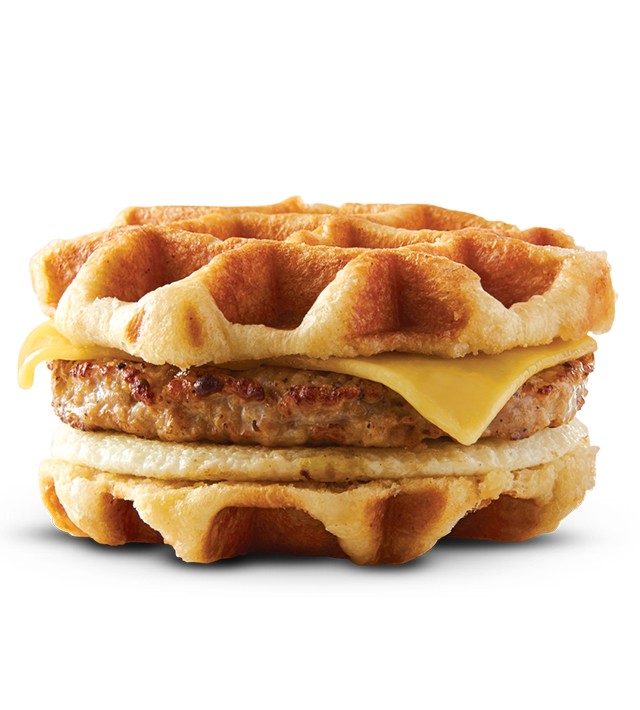 Chicken apple gouda sausage, gouda cheese and a cage-free fried egg sandwiched between two maple waffles.