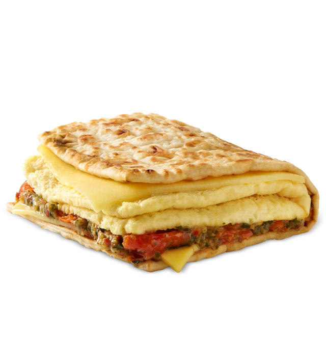 JUST Egg™ folded egg patty, roasted tomatoes, vegan pesto cream cheese spread and vegan smoked provolone on a folded flatbread.